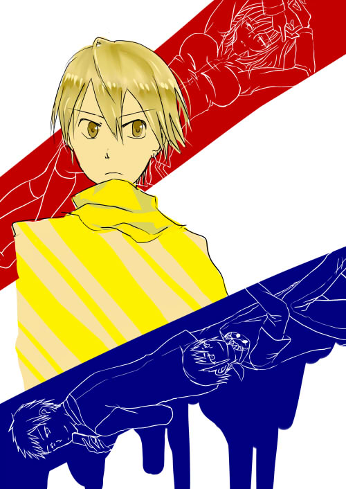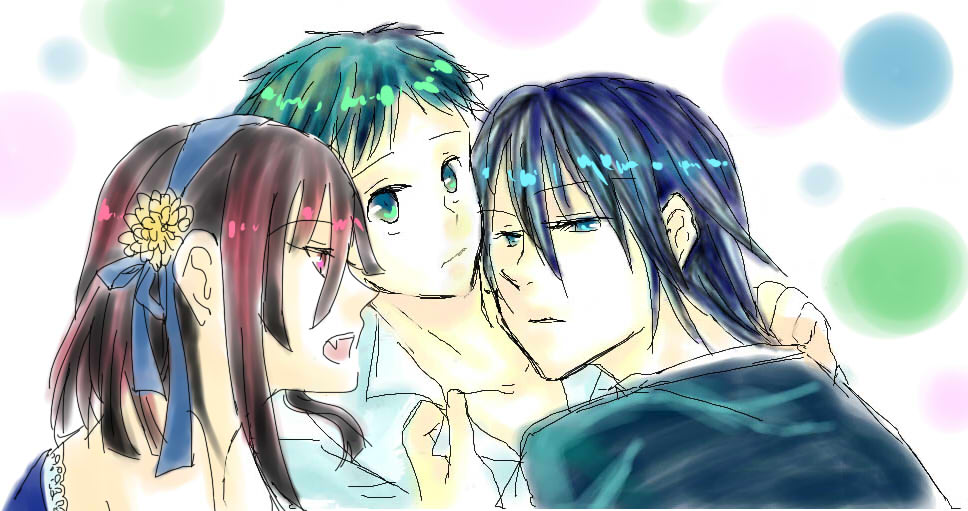 目に痛いのは正臣誕付近で描いてたやつです。正臣誕で正帝小説書こうとしてたんですが、その時私の中で正臣が「将軍モード!」とか言って帝人を押さえつけて…なネタを考えてたんですが無理でした。「将軍」っぽい正臣だけ継承してこんな絵になりました。来良三人の絵とか落書き好きです。でも正臣描くの苦手です。あ、これ青葉居た。まぁ…来良が好きです(笑)